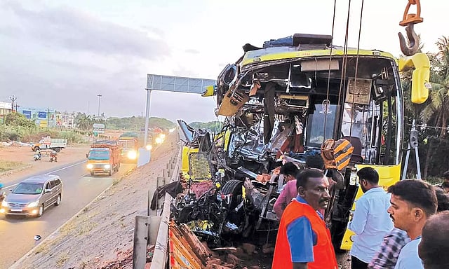 அதிக பாரம் காரணமாக லாரி மெதுவாக சென்ற நிலையில் அதிவேகமாக வந்த பஸ், டிரைவரின் கட்டுப்பாட்டை இழந்து லாரி மீது மீது மோதி விபத்தை ஏற்படுத்தியது போலீஸ் விசாரணையில் தெரியவந்தது.