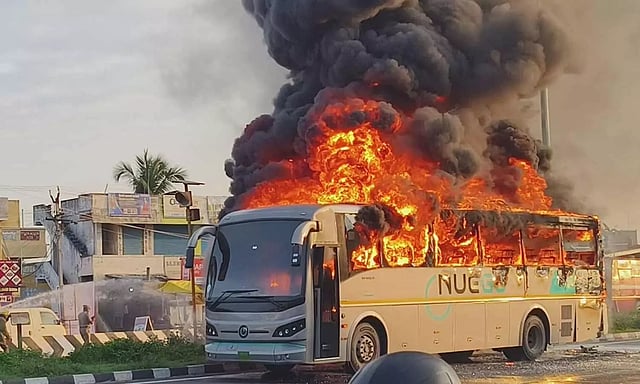 பஸ் டிரைவர் அம்ரிஷ் பீன்ஸ் மற்றும் அவ்வழியே சென்ற பொதுமக்கள் தீயை அணைக்க முயன்றும் முடியவில்லை. தீ பஸ் முழுவதும் கரும்புகையுடன் பற்றி எரிந்தது. இதனால் அப்பகுதியில் பரபரப்பு ஏற்பட்டது.