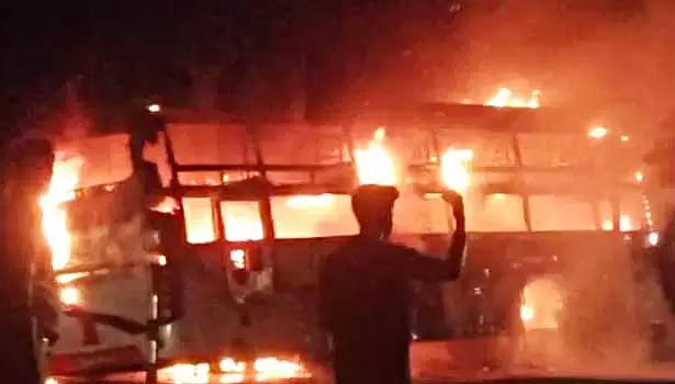 நான்கு வழிச்சாலையில் ஆம்னி பஸ் தீப்பிடித்து எரிந்த சம்பவத்தால் சாத்தூரில் நள்ளிரவில் பரபரப்பு ஏற்பட்டது.