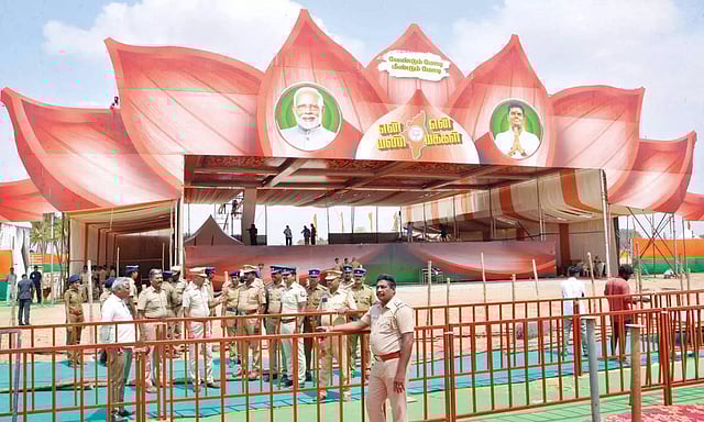 பொதுக்கூட்ட மேடையானது தெற்கு நோக்கி இருக்கும் வகையில் 80 அடி நீளம், 60 அடி அகலம் கொண்டதாக பிரமாண்டமாக அமைக்கப்பட்டு இருந்தது. மேடையின் மேல் பகுதியில் தாமரைசின்னம் பொறிக்கப்பட்டு வேண்டும் மோடி, மீண்டும் மோடி என்ற வாசகத்துடன் மோடி மற்றும் அண்ணாமலையின் படங்கள் இடம் பெற்றிருந்தது. 5 லட்சம் சேர்கள் போடப்பட்டு இருந்தது.