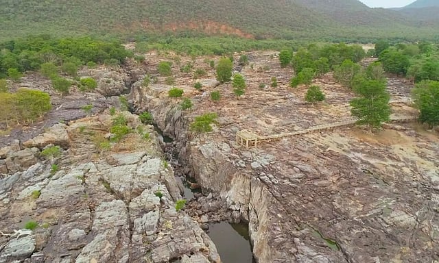 தண்ணீர்வரத்து இல்லாத காரணத்தால் ஆற்றுப்பகுதி பாறைகளாக காட்சியளிக்கிறது.