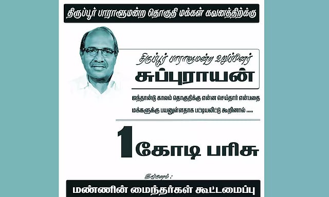 இந்தநிலையில் திருப்பூர் பாராளுமன்ற உறுப்பினர் சுப்பராயன் தனது தொகுதிக்கு செய்த பணிகளை பட்டியலிட்டு கூறினால் ரூ.1கோடி பரிசு என்ற போஸ்டர் மண்ணின் மைந்தர்கள் கூட்டமைப்பு என்ற பெயரில் தொகுதியின் பல இடங்களில் ஒட்டப்பட்டுள்ளது.