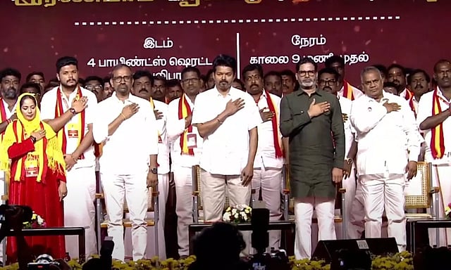தமிழக வெற்றிக்கழகத்தின் இரண்டாம் ஆண்டு தொடக்க விழா தமிழ்தாய் வாழ்த்துடன் கோலாகலமாக தொடங்கியது. விழா மேடையில் த.வெ.க. தலைவர் விஜய், தேர்தல் வியூக வகுப்பாளர் பிரசாந்த் கிஷோர், ஆதவ் அர்ஜூனா, த.வெ.க. பொதுச்செயலாளர் புஸ்ஸி ஆனந்த், மற்றும் மாவட்ட நிர்வாகிகள் வீற்றிருந்தனர்.