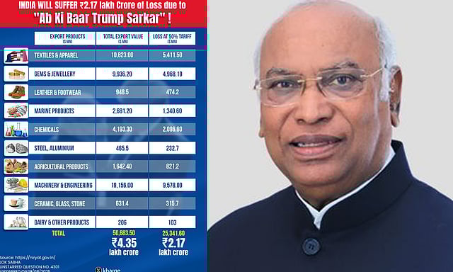 அமெரிக்காவின் 50 சதவீத வரிவிதிப்பால் இந்தியாவுக்கு ரூ.2.17 லட்சம் கோடி இழப்பு ஏற்படும் என்று காங்கிரஸ் தலைவர் மல்லிகார்ஜூன கார்கே தெரிவித்துள்ளார்.