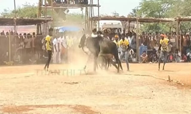 மாடு முட்டியதில், சேலம் வணங்கம்பாடியை சேர்ந்த மாடுபிடி வீரர் கார்த்திக் பரிதாபமாக உயிரிழந்துள்ளார்.