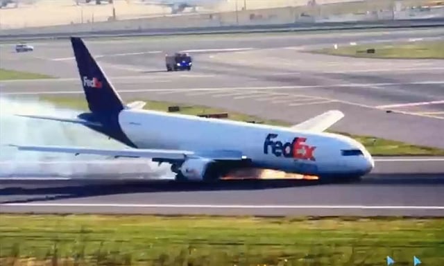 பெட்எக்ஸ் (FedEx) எக்ஸ்பிரஸ் நிறுவனத்திற்கு சொந்தமான போயிங் 767 விமானம் பின் தரையிறங்கும் கியரை மட்டுமே பயன்படுத்தி தரையிறங்கியதால் விமானத்தின் முன்பகுதி தரையுடன் மோதி தீப்பொறி பறந்தது.