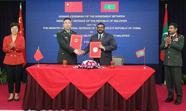 மாலத்தீவு பாதுகாப்பு அமைச்சர் கசான் மவுமூன், சீன அரசின் சர்வதேச ராணுவ ஒத்துழைப்பு அலுவலக துணை இயக்குனர் மேஜர் ஜெனரல் ஜாங் பாகுன் ஆகியோர் ஒப்பந்தங்களை பரிமாறி கொண்டனர். இந்த ஒப்பந்தம் மூலம் மாலத்தீவுக்கு இலவச ராணுவ உதவிகளை வழங்க சீனா உறுதியளித்துள்ளது. சமீபத்தில் சீனாவின் உளவுக்கப்பல் மாலத்தீவில் நிலை நிறுத்தப்பட்டது என்பது குறிப்பிடத்தக்கது.