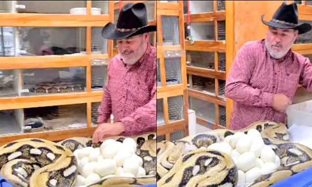 சாதாரணமாக முட்டையிடும் இனங்கள் அதை அடைகாக்கும் போது அதன் முட்டைகள் மீது யாராவது கை வைத்தால் ஆக்ரோஷமாகிவிடும். அவ்வாறு ஜேப்ரூவர் என்ற உயிரியல் பூங்கா காப்பாளர் தனது பூங்காவில் பராமரிக்கப்பட்டு வரும் ராட்சத மலைப்பாம்பு அருகே செல்கிறார்.