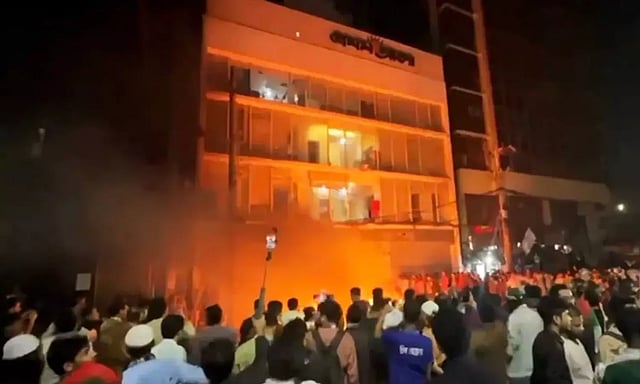 போராட்டக்காரர்கள் டாக்காவில் உள்ள 'புரோதோம் ஆலோ' (Prothom Alo) மற்றும் 'தி டெய்லி ஸ்டார்' (The Daily Star) ஆகிய முன்னணி பத்திரிகை அலுவலகங்களை அடித்து நொறுக்கி தீ வைத்தனர்.