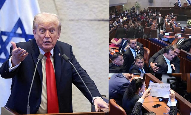 அவர் பாராளுமன்றத்தில் உரையாற்றிக் கொண்டிருந்தார். அப்போது திடீரென இரண்டு உறுப்பினர்கள் டிரம்பிற்கு எதிர்ப்பு தெரிவித்து முழக்கமிட்டனர். இதனால் இஸ்ரேல் பாராளுமன்றத்தில் பரபரப்பு ஏற்பட்டது. அவர்கள் இருவரும் அவை பாதுகாவலர்களால் வெளியேற்றப்பட்டனர். பின்னர் டிரம்ப் தொடர்ந்து உரையாற்றினார்.