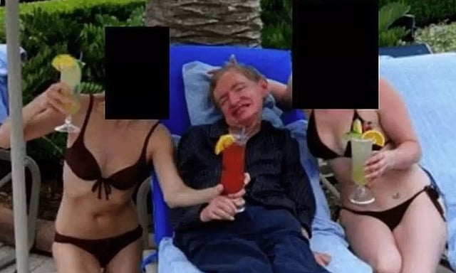 அவர்களில் ஒரு பெண் ஹாக்கிங்கின் கையில் காக்டெய்ல் பானத்தை வைத்திருக்கிறார். இது அறிவியல் மாநாடு நடந்த செயின்ட் தாமஸ் தீவில் எடுக்கப்பட்டதாக கூறப்படுகிறது.