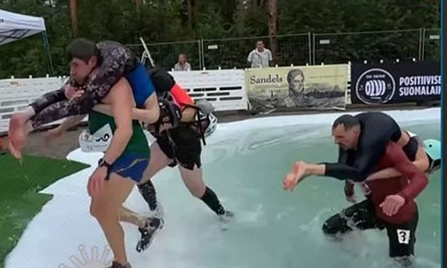 மனைவிகளை கணவர்கள் சுமந்து செல்லும் வித்தியாசமான போட்டி பின்லாந்தில் நடைபெற்றுள்ளது.