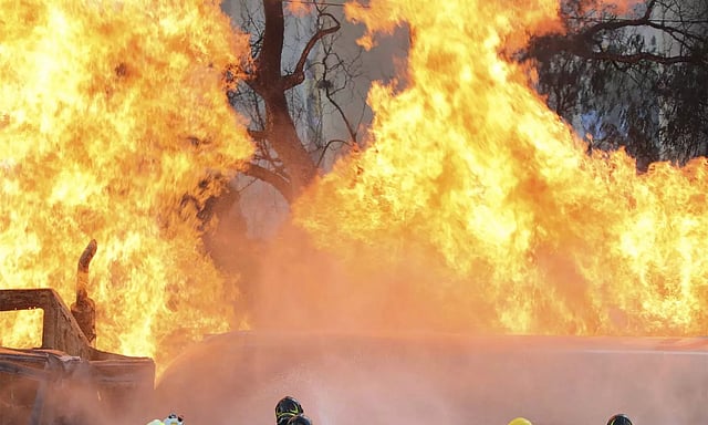 அப்போது திடீரென டிரைவரின் கட்டுப்பாட்டை இழந்த லாரி நடுரோட்டில் கவிழ்ந்தது. அதன்பின் பயங்கர சத்தத்துடன் வெடித்துச் சிதறியது. இந்த தீயால் சாலையில் சென்று கொண்டிருந்த 18 வாகனங்கள் தீப்பிடித்து எரிந்தன. இதனால் அந்த இடம் போர்க்களம் போல மாறியது.