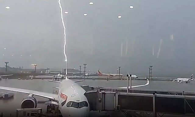 இந்த வீடியோ இணையத்தில் பரவி வருகிறது. இதுகுறித்து பெர்ன்ஹார்டு வார் கூறுகையில், பெரிய புயல் வீசியது. இதனால் விமானங்கள் தரையில் நிறுத்தி வைக்கப்பட்டிருந்தன. நாங்களும் பாதுகாப்பான இடத்தில் அமர்ந்திருந்தோம். அப்போது தான் விமானத்தின் வால் பகுதியில் கடுமையாக மின்னல் தாக்கியதை வீடியோ எடுத்தேன் என்றார்.