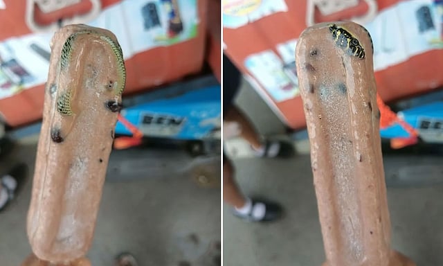 தாய்லாந்து நாட்டில் ஒருவர் தள்ளுவண்டி கடைக்காரரிடம் குச்சி ஐஸ் ஒன்றை வாங்கி, கவரை பிரித்துள்ளார். அப்போது அதில் வித்தியாசமாக ஏதோ ஒட்டியிருப்பதைக் கவனித்து உற்றுப் பார்த்தவர் அதிர்ந்து போனார். ஒரு சிறிய பாம்பு ஐஸ் கட்டியில் உறைந்து போய் இருந்தது.