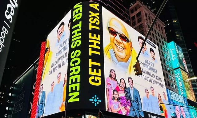 அந்த வகையில் அமெரிக்காவில் உள்ள தமிழகத்தைச் சேர்ந்த தொழிலதிபரும் நியூ யார்க் தமிழ் சங்கத் தலைவருமான கதிர்வேல் குமாரராஜா தனது குடும்பத்துடன் சேர்ந்து கலைஞருக்கு மரியாதை செலுத்தும் வகையில் தனது காசை செலவுசெய்து, நியூ யார்க் டைம்ஸ் சதுக்கத்தில் முழு அளவிலான விளம்பரப் பலகையில் கலைஞரின் புகைப்படத்தை இடம்பெறச் செய்துள்ளார். அதில் முதல்வர் மு.க.ஸ்டாலின், உதயநிதி ஸ்டாலின் மற்றும் கதிர்வேல் ராஜாவின் குடும்பத்தினர் புகைப்படங்களும் இடம்பெற்றுள்ளன. பிரசித்தி பெற்ற டைம்ஸ் சதுக்கத்தில் வகையில் கலைஞரின் புகைப்படம் பிரதிபலிக்கும் வீடியோ சமூக வலைத்தளங்களில் வைரலாகி வருகிறது.