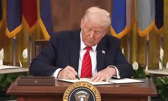 வெள்ளை மாளிகையில் உள்ள கிழக்கு அறையில் அமைக்கப்பட்ட மேசைகளில் சுற்றி அமரவைக்கப்பட்டு இருந்த பள்ளி மாணவர்கள் மத்தியில் டொனால்டு டிரம்ப் மத்திய கல்வித்துறையை கலைக்கக் கோரிய உத்தரவில் கையெழுத்திட்டார். பிறகு தான் கையெழுத்திட்ட ஆவணங்களை உயர்த்திப் பிடித்தப்படி சிரித்தார்.