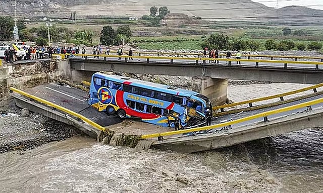பெரு நாட்டில் பாலம் இடிந்து விழுந்ததில் டபுள் டெக்கர் பேருந்து ஆற்றுக்குள் விழுந்தது. இந்த விபத்தில் 2 பேர் உயிரிழந்தனர். மேலும் 40க்கும் மேற்பட்டோர் காயமடைந்தனர் என்று அதிகாரிகள் தெரிவித்தனர்