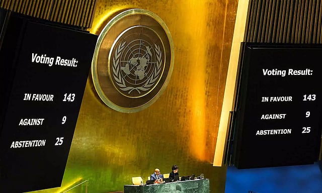 தீர்மானத்திற்கு இந்தியா உள்பட 143 நாடுகள் ஆதரவு தெரிவித்து வாக்களித்தன. அமெரிக்கா, இஸ்ரேல் உள்பட 9 நாடுகள் எதிராக வாக்களித்தன. 25 நாடுகள் வாக்கெடுப்பில் பங்கேற்காமல் புறக்கணித்தன.