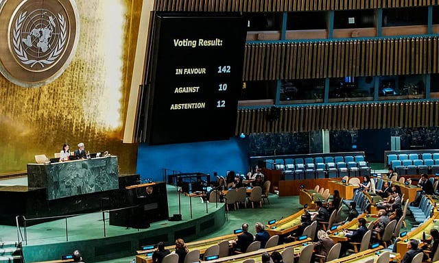 அமெரிக்காவில் ஐக்கிய நாடுகள் சபையின் பொதுச் சபையில் காசா போருக்கு தீர்வு காணும் நியூயார்க் பிரகடனம் மீது நேற்று வாக்கெடுப்பு நடைபெற்றது.