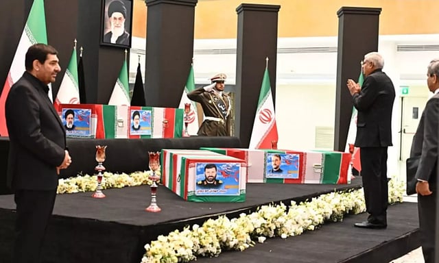 இந்நிலையில், டெஹ்ரானில் வைக்கப்பட்டுள்ள ஈரான் அதிபர் இப்ராஹிம் ரைசியின் உடலுக்கு துணை ஜனாதிபதி ஜெகதீப் தன்கர் அஞ்சலி செலுத்தினார்.