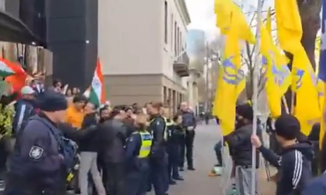 தூதரகத்தில் இருந்த பலர் தேசபக்தி பாடல்களைப் பாடிக்கொண்டிருந்தனர். அப்போது அங்கு வந்தவர்களில் சிலர் காலிஸ்தான் கொடிகளை அசைத்து கோஷங்களை எழுப்பி போராட்டத்தில் ஈடுபட்டனர்.