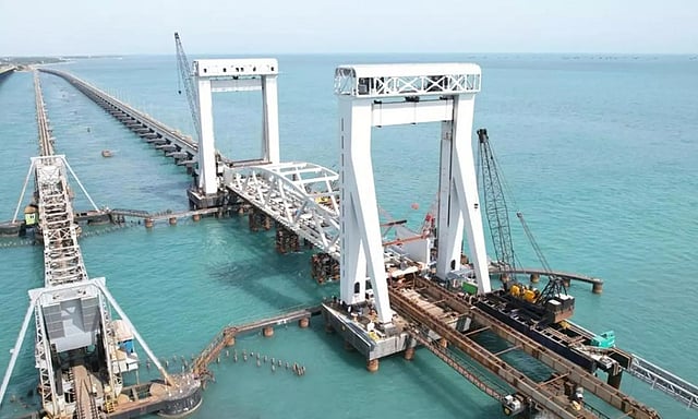 இதனிடையே, பாம்பன் கடலில் ரூ.546 கோடி மதிப்பில் கட்டப்பட்ட புதிய ரெயில் பாலம் கட்டி முடிக்கப்பட்டது. கடல் மட்டத்தில் இருந்து சுமார் 17 மீட்டர் உயரத்தில் அமைக்கப்பட்டுள்ள இந்த பாலத்தின் நடுவில் 650 டன் எடை கொண்ட தூக்குப் பாலமும் அமைக்கப்பட்டு உள்ளது. கப்பல்கள் செல்லும்போது இந்த செங்குத்து பாலம் செங்குத்து வடிவில் திறக்கும்.