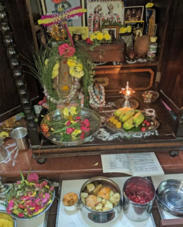 அருகில் 5 முக குத்து விளக்கு ஏற்றி வைக்க வேண்டும். 5 வகை பூக்கள், 5 வகை நறுமணப்பொருட்கள், 5 வகை பழங்கள் படைக்க வேண்டும். அத்துடன் அவல், பொரி, கடலை கொழுக்கட்டை, மோதகம், அப்பம், சுண்டல், தாம்பூலம் ஆகியவற்றை வைத்து தீபம்காட்டி வழிபட வேண்டும். இவ்வாறு வழிபட வரமும் கிடைக்கும். வளமும் பெருகும்.