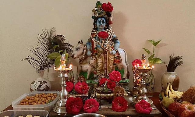 கிருஷ்ணனின் படத்தை அலங்கரித்து, மாலைகளும், மலர்களும் சூடி அவனுக்கு பிடித்தமான வெண்ணெய், அவல், இனிப்பு வகைகள், சீடை, முறுக்கு, தேன்குழல், பொங்கல் போன்ற நைவேத்யங்கள் படைத்து அவரவர் குடும்ப வழக்கப்படி விரதம் இருந்து பூஜைகள் செய்து வழிபடுவர். அந்த நீல வண்ணக் கண்ணன் நம் இல்லம் வந்து அருள்புரிய மனதார வேண்டி பிரார்த்தனை செய்கின்றோம்.