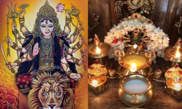 அந்த எலுமிச்சம்பழக் கிண்ணத்தில் நெய் ஊற்றி திரி போட்டு ஏற்றி மலர்களால் அலங்கரிக்கப்பட்ட துர்க்கா தேவியின் படத்தின் முன்போ, அல்லது சிலையின் முன்போ வைத்து பூஜையை ஆரம்பிக்க வேண்டும்.
