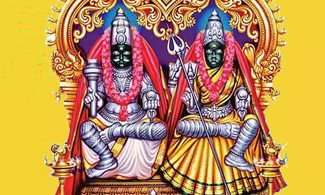 முன்பொரு காலத்தில் வியாபாரிகள் தோனிகளில் சரக்குகளை எடுத்து சென்று வியாபாரம் செய்து வருவது வழக்கம். ஒரு செட்டியார் தன் மனைவியுடன் குலசேகர பட்டின கடற்கரையில் சென்றபோது கடல் அலையால் அவருடைய சரக்குகள் கடலில் மூழ்கியது. வேதனையுற்ற செட்டியாரும், அவர் மனைவியும், சிவனை வேண்டினார்கள். சிவனும் அவர்கள் மீது இரக்கம் கொண்டு அவர்களுக்கு காட்சி தந்து என்ன வரம் வேண்டும் என கேட்டார். "ஆண்டவனே எங்களுக்கு காட்சி தந்ததே நாங்கள் செய்த பாக்யம், நீங்கள் (சிவனும் பார்வதியும்) இருவரும், திருமண கோலத்தில் இதே போல் பக்தர்களுக்கு காட்சி தர வேண்டுகிறேன் என்று வேண்டினார். இறைவனும் "அவ்வாறே ஆகட்டும்" என்று கோயில் பீடத்தில் காட்சி தருகிறார்.
