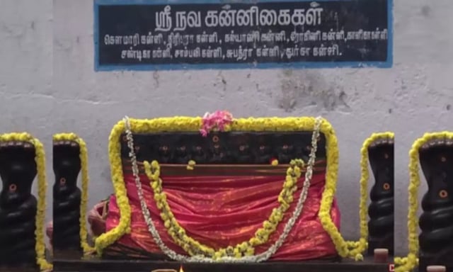 அம்மனோடு சேர்த்து ஒன்பது கன்னிகைகளாக கோவிலிலில் பிரதிஷ்டை செய்துள்ளனர்.