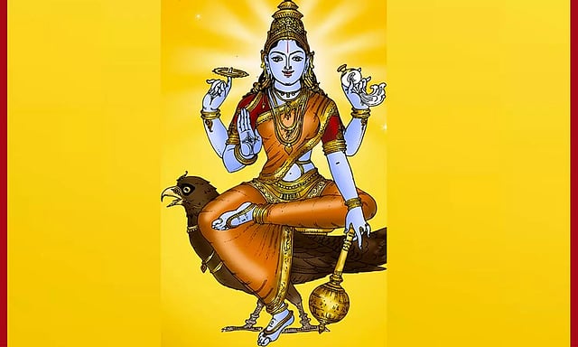 சங்கு, சக்கரம், கதை, வில் ஆகியவற்றை கொண்டிருப்பவள்.