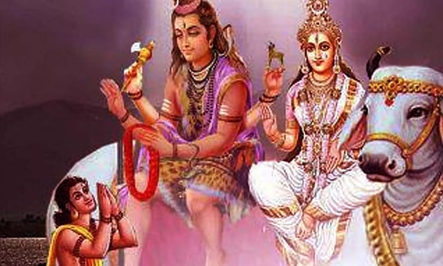 இறுதியில் சோர்ந்து விழுந்து விட்டான். பார்வதி தேவியுடன் ரிஷபாரூடராய் சிவபெருமான் காட்சியளித்தார்