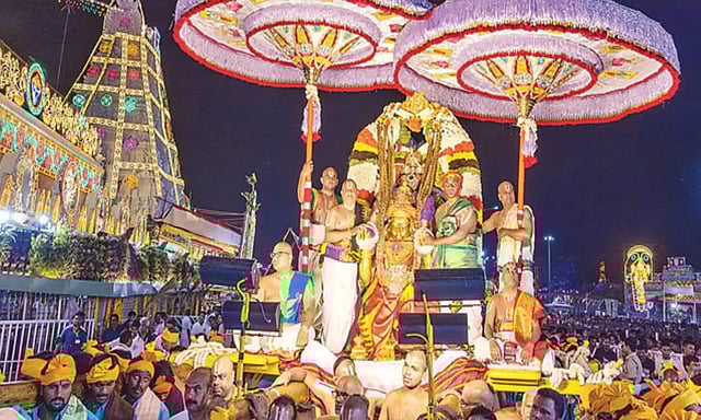 திருப்பதி பிரம்மோற்சவ விழாவில் நேற்று இரவு கருட சேவை நடந்தது. இந்த ஆண்டு முன்கூட்டியே அதாவது மாலை 6.30 மணிக்கு தங்க கருட வாகனத்தில் தங்க வைர நகை அலங்காரத்துடன் ஏழுமலையான் எழுந்தருளினார். 4 லட்சம் பக்தர்கள் மாட வீதிகளில் திரண்டு இருந்தனர்.