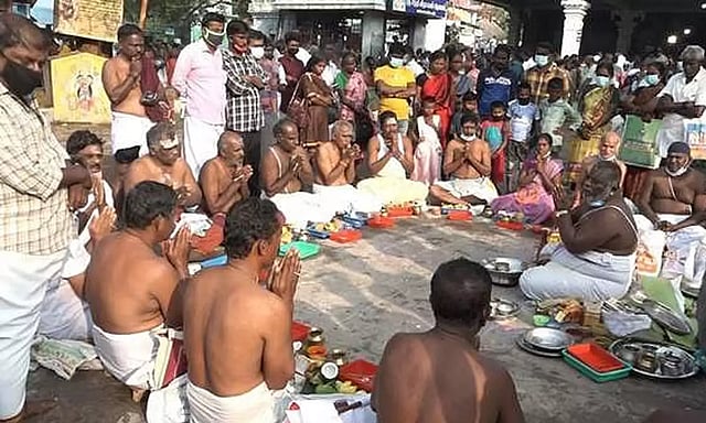 திருச்சிக்கு அருகில் உள்ள சமயபுரம் மாரியம்மன் கோவிலில், தை அமாவாசை அன்று புதிய வட்டமான மூங்கில் தட்டில் வெற்றிலை, பாக்கு, தேங்காய், பழங்கள், மலர்ச்சரங்கள், வாழைக்காய், பூசனிக்காய் வைத்து, அதனை கோவில் அர்ச்சகரிடம் கொடுத்து அம்மன் சன்னதியில் சமர்ப்பிக்கிறார்கள். மறைந்த தங்கள் பெற்றோரின் பெயர், நட்சத்திரம் சொல்லி அர்ச்சனை செய்யச் சொல்கிறார்கள்.