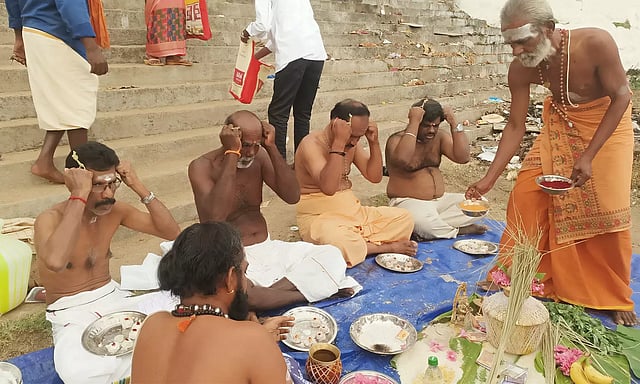அவிநாசிலிங்கேஸ்வரர் கோவில் வளாகத்தில், நல்லா ற்றங்கரை மண்டபத்தில், நூற்றுக்கணக்கான பக்தர்கள் தங்கள் முன்னோருக்கு தர்ப்பணம் செய்தனர்.