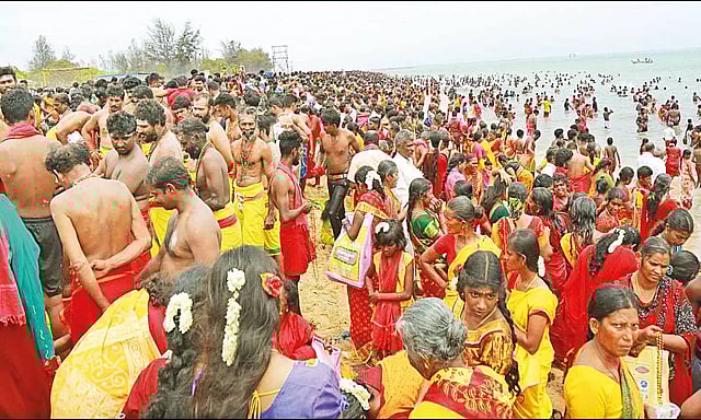குலசேகரன்பட்டினம் முத்தாரம்மன் கோவிலில் தசரா திருவிழா கொடியேற்றத்துடன் கோலாகலமாக நேற்று தொடங்கியது. விழாவையொட்டி கடற்கரையில் குவிந்த பக்தர்கள் புனிதநீர் எடுத்து சென்று வழிபட்டனர்.