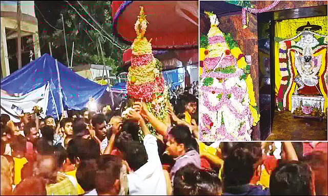 நள்ளிரவிலும் காப்பு கட்டும் நிகழ்ச்சியில் திரளான பக்தர்கள் திரண்டிருந்தனர். பூங்கரகம் கோவில் வளாகத்தை சுற்றி வந்து மூலவர் சன்னதியை அடைந்தது. காப்பு கட்டும் நிகழ்ச்சியை முன்னிட்டு வாணவேடிக்கை நடைபெற்றது.