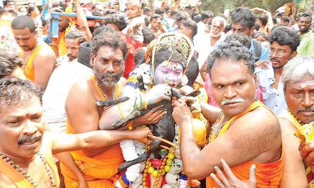 மேலும், சில பக்தர்கள் சுடுகாட்டின் புதைக்குழியில் கிடந்த இறந்த மனிதர்களின் மண்டை ஓடு மற்றும் எலும்புகள் ஆகியவற்றுடன் ஆடு, கோழிகளை வாயில் கவ்வியபடி ஆக்ரோஷத்துடன் ஊர்வலமாக சென்றனர்.