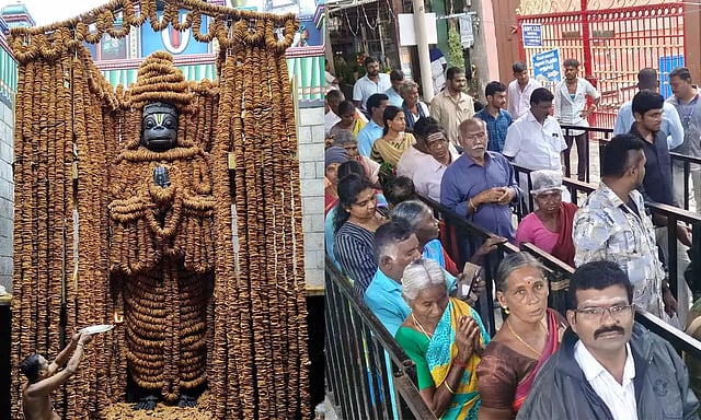 பக்தர்கள் வரிசையாக சென்று வரும் வகையில் கோவில் பகுதிகளிலும், கோவில் அமைந்துள்ள தெருக்களிலும் பேரிகார்டு வைத்து தடுப்புகள் அமைக்கப்பட்டது. பக்தர்கள் வரிசையாக வந்து ஆஞ்சநேயரை வழிபட்டு செல்கின்றனர். 5 இடங்களில் அன்னதானம் வழங்க ஏற்பாடு செய்யப்பட்டு தொடர்ந்து பக்தர்களுக்கு பிரசாதம் வழங்கப்பட்டது.