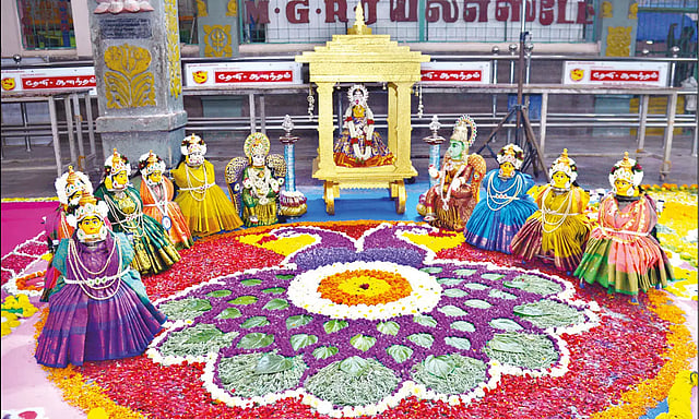 பின்னர் கோவில் மண்டபத்தில் துர்க்கை, லட்சுமி, சரஸ்வதி அலங்காரம் மற்றும் ரோஜா, மல்லிகை, சம்பங்கி உள்பட பல்வேறு மலர்களால் சிவன், முருகன், ஆண்டாள், வாராகி அம்மன் கோலங்கள் போடப்பட்டது. இதேபோல் பூத்தமலர் பூ அலங்காரத்தில், கரகங்கள் அலங்கரித்து வைக்கப்பட்டிருந்தன. இதைத்தொடர்ந்து அம்மனுக்கு சிறப்பு பூஜைகள் நடைபெற்றன. பின்னர் பக்தர்கள் சாமி தரிசனம் செய்ய அனுமதிக்கப்பட்டனர்.