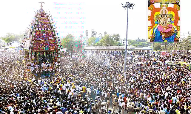 தொடர்ந்து, கோவிந்தா... அங்காளம்மா... ஈஸ்வரி தாயே என்ற பக்தி கோஷங்களை விண்ணதிர முழங்கியவாறு ஏராளமான பக்தர்கள், தேரை வடம்பிடித்து இழுத்தனர். இந்த தேர், பக்தர்களின் வெள்ளத்தில் கோவிலைச்சுற்றி அசைந்தாடியபடி நிலைக்கு வந்தது.