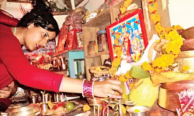 கும்ப கலசத்தினுள் பச்சரிசி, எலு மிச்சம்பழம், பொற்காசுகள் ஆகியவற்றை இடவேண்டும். கும்பத்தை வெண்மையான பட்டு வஸ்திரத்தால் அலங்கரித்து அம்பாளின் முகத்தை அமைக்க வேண்டும். மஞ்சள் சரடை கும்பத்தின் மீது சாத்த வேண்டும். அம்பாளை கிழக்கு முகமாக எழுந்தருளச் செய்ய வேண்டும். நாம் வலது பக்கம் அமர்ந்து பூஜை செய்ய வேண்டும். மஞ்சள் சரடையும் கும்பத்துடன் சேர்த்து பூஜிக்க வேண்டும்.