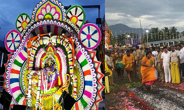 இதையடுத்து கோவில் தலைமை பூசாரி ரகுபதி பூ குண்டத்திற்கு சிறப்பு பூஜைகள் செய்து எலுமிச்சைப்பழம், பூ பந்துகளை குண்டத்தில் உருட்டினார். பின்னர் அவர் முதன்முதலாக குண்டம் இறங்கி தொடங்கி வைத்தார், அவரை தொடர்ந்து பூக்கூடை மற்றும் அம்மன் கரகத்தை சுமந்து வந்தவர்கள் குண்டம் இறங்கினர்.