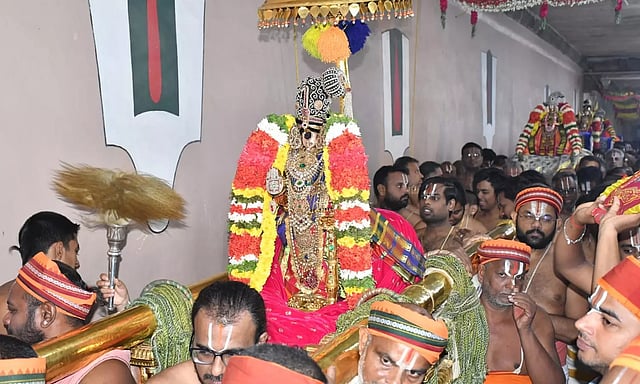 ஸ்ரீரங்கம் ரெங்கநாதர் கோவிலில் வைகுண்ட ஏகாதசி பகல் பத்து உற்சவத்தின் 7-ம் நாளான நேற்று நம்பெருமாள் முத்து ஆண்டாள் கொண்டை, வைர காதுகாப்பு, வைர அபயஹஸ்தம், பங்குனி உத்திர பதக்கம், வைர, ரத்தின லட்சுமி பதக்கம், மகர கர்ண பத்ரம், புஜகீர்த்தி, ரங்கூன் அட்டிகை, சந்திர வில்லை, காசு மாலை, 2 வட முத்து மாலை, ஒட்டியாணம், அடுக்கு பதக்கங்கள்உள்ளிட்ட திரு ஆபரணங்கள் அணிந்து, வெளிர் பச்சை நிற பட்டு உடுத்தி அர்ச்சுன மண்டபத்தில் எழுந்தருளி பக்தர்களுக்கு அருள்பாலித்தார்.