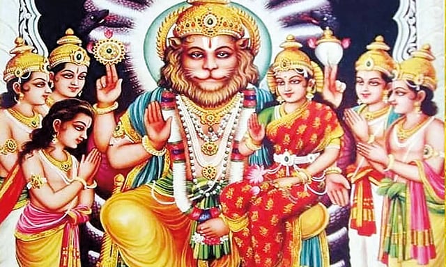 "மரியாதைக்குரிய எனது தெய்வமான விஷ்ணு பகவான், நீங்கள் நினைப்பது போல் ஓரிடத்தில் மட்டுமே இருப்பவர் அல்ல.. அவர் எங்கும் நிறைந்திருப்பவர்" என்றான், பிரகலாதன். அப்போது இரண்யகசிபு அங்கிருந்த ஒரு தூணைக் காட்டி "இந்த தூணில் உன் ஹரி இருக்கிறானா?" என்றான். அதற்கு பிரகலாதன் "நிச்சயம் இருப்பார்" என்று பதிலளித்தான். உடனே இரண்யகசிபு, தன் வலிமையான கதாயுதத்தைக் கொண்டு அந்தத் தூணை பிளந்தான். அப்போது அதன் உள்ளே இருந்து, சிங்க முகமும், மனித உடலும் கொண்ட நரசிம்மர் தோன்றினார்.
