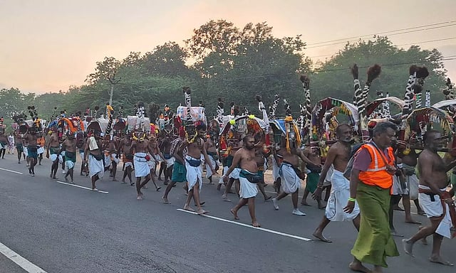 அதன்படி இந்த வருடம் கடந்த 2-ந்-தேதியன்று தேவக்கோட்டை நகரப் பள்ளியில் இருந்து காவடிகளுக்கு பூஜை செய்து இக்குழுவினர் புறப்பட்டனர். தொடர்ந்து பல்வேறு ஊர்களை கடந்து இவர்கள் இன்று காலை திண்டுக்கல் மாவட்டம் நத்தம் வந்தடைந்தனர்.