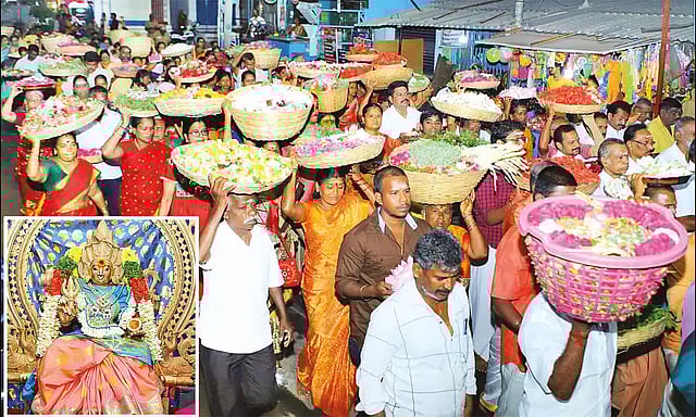 இதைத்தொடர்ந்து பக்தர்கள் பூக்களை அம்மனுக்கு சாற்றினர். அம்மனுக்கு சிறப்பு பூஜையும், அபிஷேகமும் நடைபெற்றது. தொடர்ந்து பக்தர்கள் தாம்பூல தட்டிலும், கூடை, கூடையாகவும் பூக்களை கொண்டு வந்து அம்மனுக்கு சாற்றினர்.