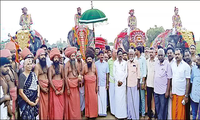 விழாவையொட்டி யாகசாலை பூஜைகள் இன்று (சனிக்கிழமை) மாலை தொடங்க உள்ளது. அதைமுன்னிட்டு தருமபுரம் ஆதீனம் முன்னிலையில் சீர்காழி அருகே உள்ள உப்பனாற்றில் இருந்து நேற்று மாலை ஆயிரத்திற்கும் மேற்பட்ட இடங்களில் இருந்து கொண்டு வரப்பட்ட புனித நீர் மற்றும் நகர எல்லையான உப்பனாற்று ஆகிய நீர்கள் அடங்கிய 4 கடங்களை, நான்கு யானைகள் மீது ைவத்து சிவாச்சாரியார்கள் ஊர்வலமாக எடுத்து வந்தனர்.